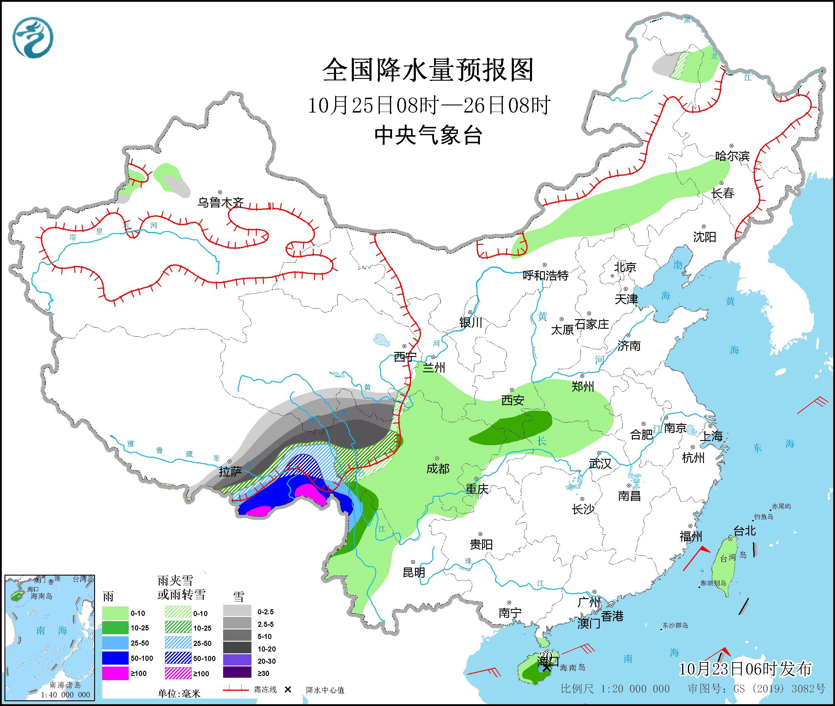 10月24日08时至25日08时,西藏南部和东部、青海南部、川西高原北部等地部分地区有小到中雪,其中,西藏东部等地部分地区有大到暴雪。西藏南部和东部、陕西北部、川西高原西部、海南岛等地部分地区有中到大雨,其中,西藏东南部、海南岛东北部等地部分地区有暴雨(50~80毫米)。内蒙古东北部和中部、西藏北部等地部分地区有4~6级风。东海大部海域、南海西北部和中东部偏北海域、琼州海峡将有7级、阵风8级的偏北到东北风,台湾海峡、台湾以东洋面、巴士海峡、南海东北部海域将有7~8级、阵风9级的东北风,其中台湾海峡的部分海域风力可达9级、阵风10级。